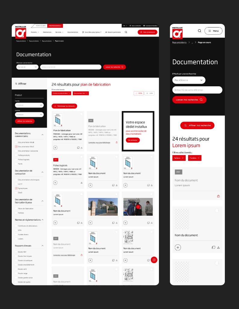 Les interfaces ont été conçues pour garantir une expérience cohérente et efficace sur l’ensemble des supports, avec des déclinaisons pensées pour le desktop (1440 et 1920) et le mobile afin de simplifier le développement, en tenant compte des usages professionnels et des contextes de consultation variés.