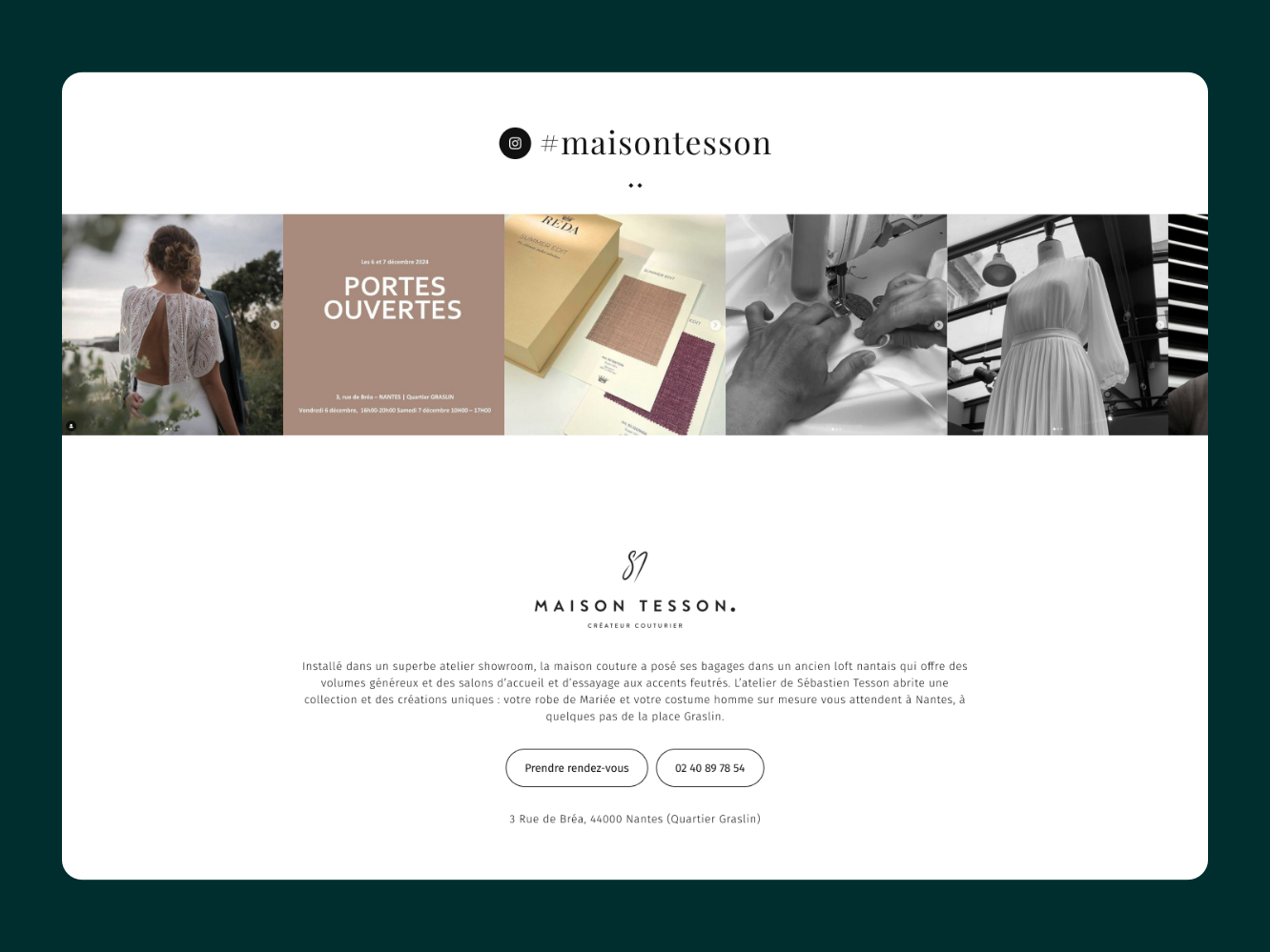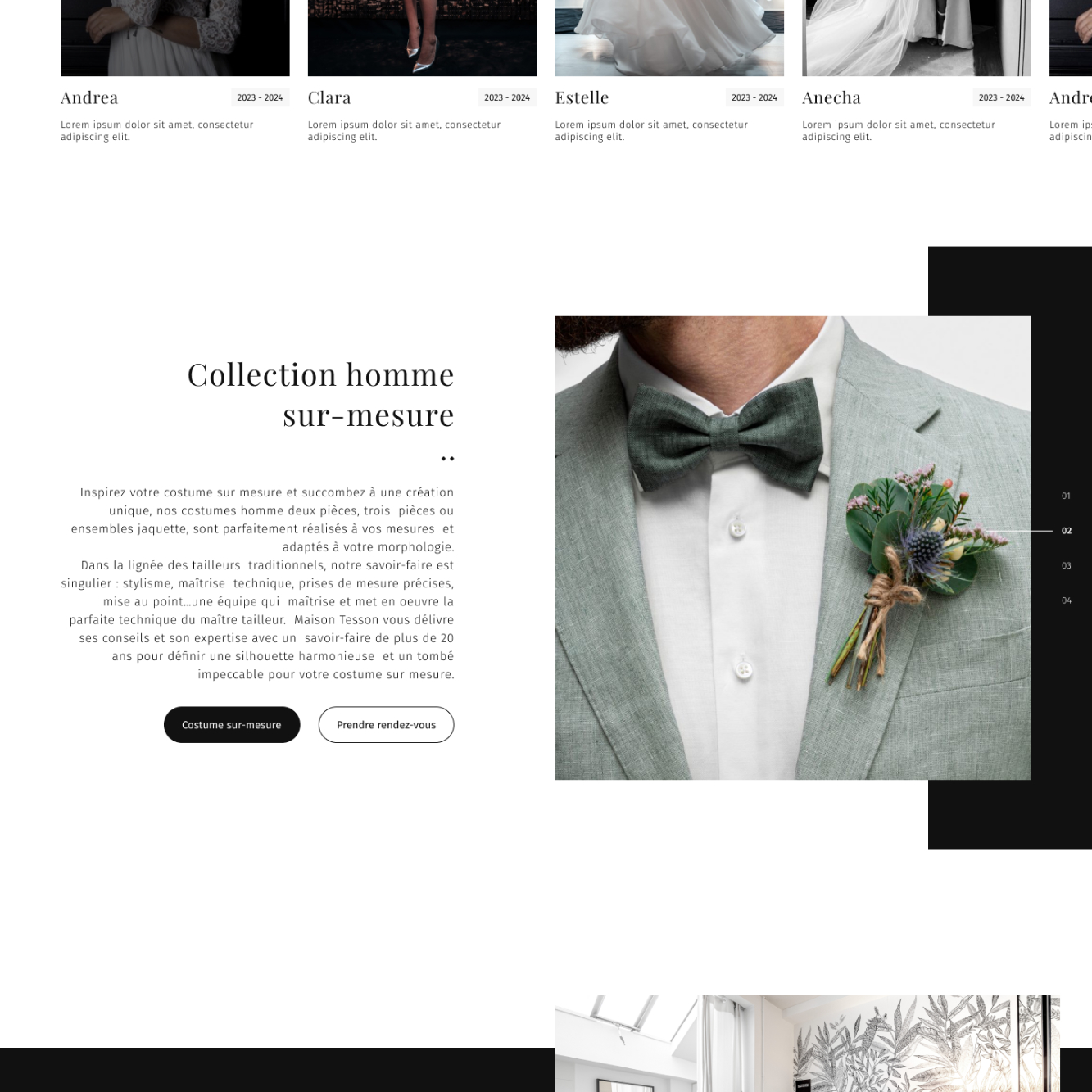 La refonte de la page d’accueil renforce l’identité de Maison Tesson en tant que maison de couture sur mesure, en mettant en avant l’élégance, la précision et l’humain au cœur du processus de création.